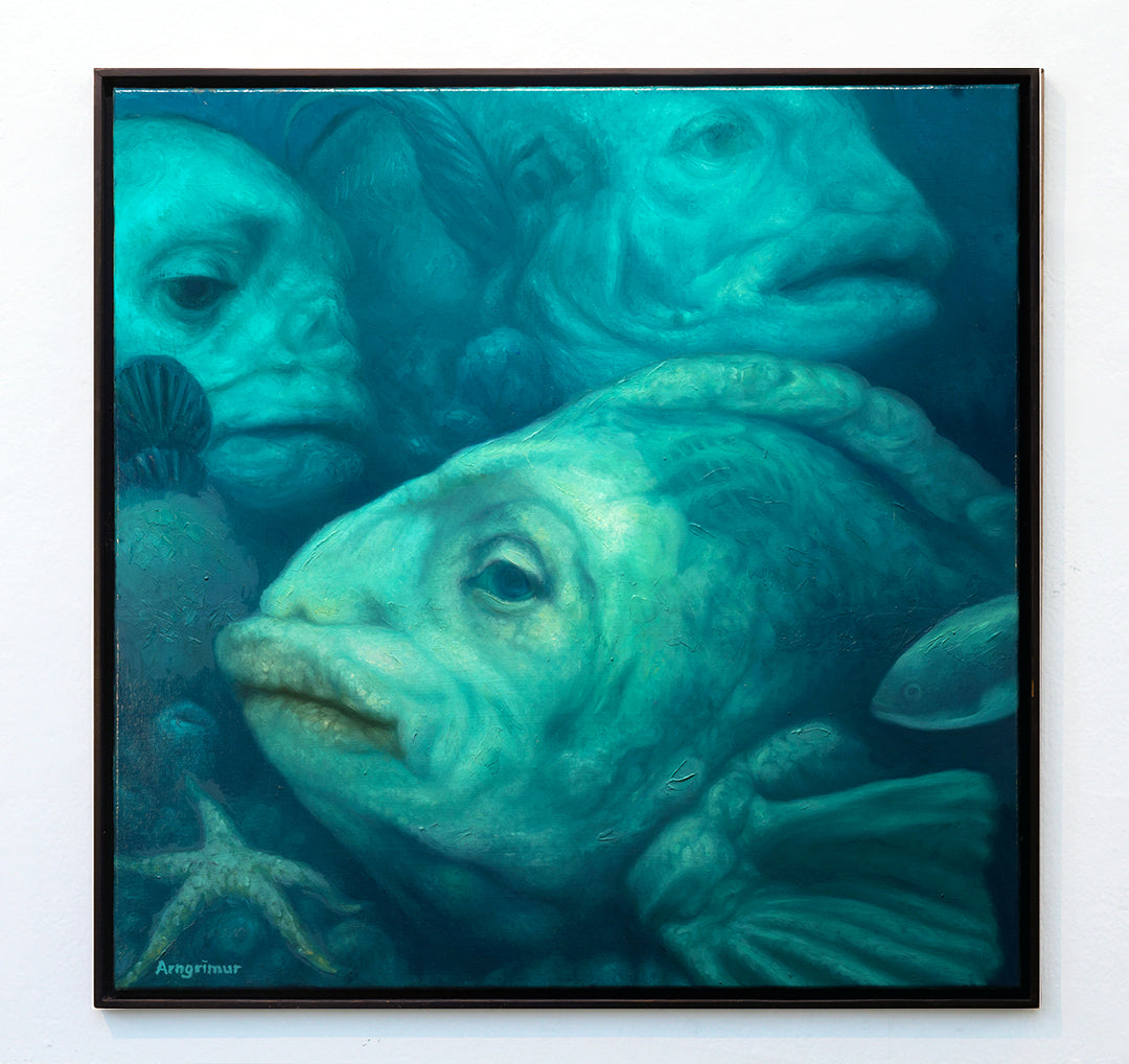 Grænar Sálir, 97x97 sm, olía á striga, 2023, myndin er í dökkum viðarramma.
