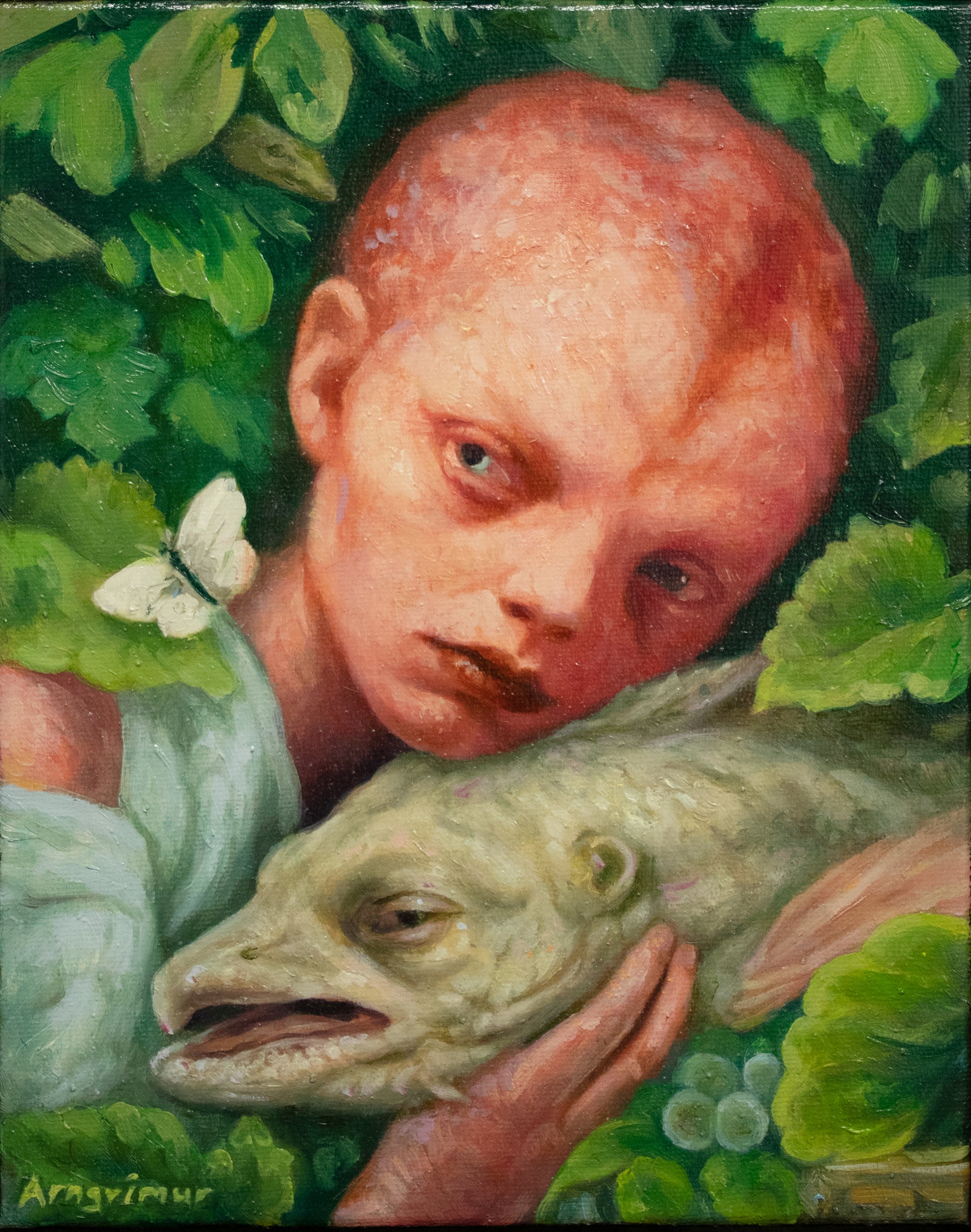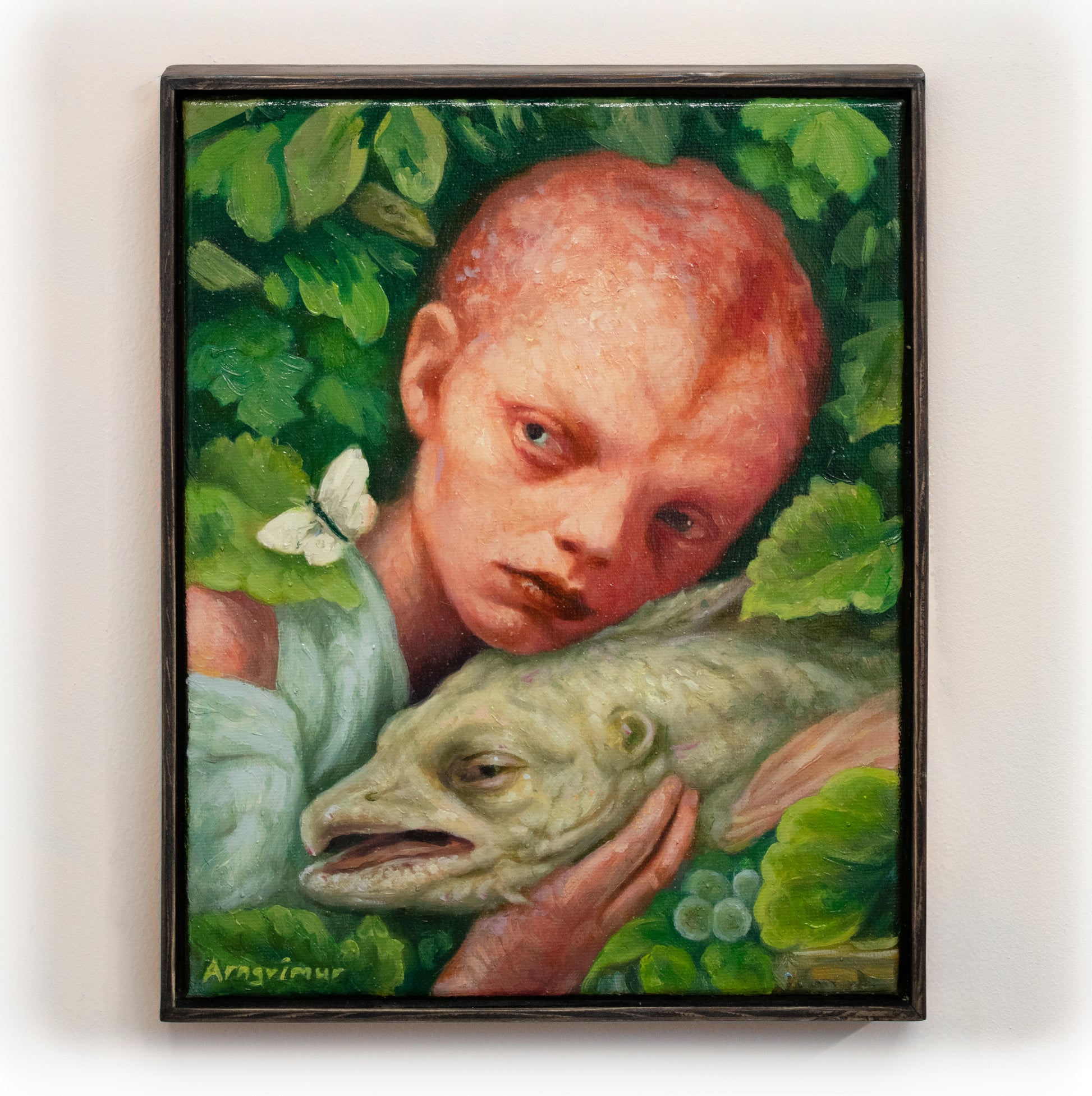 Myndin er í handsmíðuðum dökkum viðarramma.