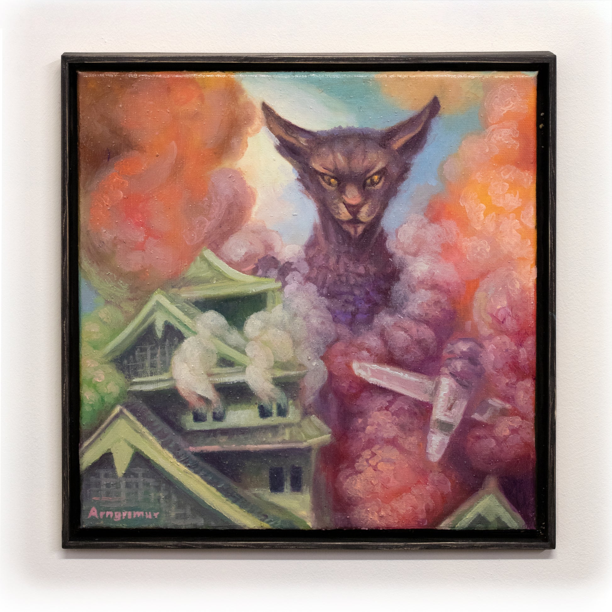 Myndin er í handsmíðuðum dökkum viðarramma.